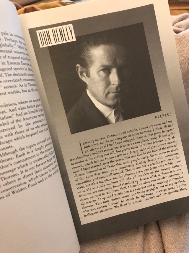 My Eagles and Don Henley fandom began in the States in 2000. I remember talking with my friend C about wanting to go to Walden Woods one day, and wanting this book. I’ve looked at it on the Walden Woods Project website so many times, telling myself to just order it, but although the book is reasonably priced, the cost of shipping alone drives it up higher than I can do, every time. I had resigned myself to thinking that perhaps if I ever do make my way there, I’d be able to buy it there as a souvenir.